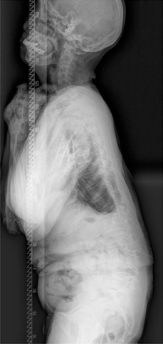 정상적으로 흉추는 기립 측면상에서 20~45도의 후만을 이루고 있습니다. 흉추 후만의 첨부는 제 7 흉추에 위치하며 흉추 후만각은 Cobb 방법상 제 4~12 흉추 사이의 각도를 측정합니다. 일반적인 방사선적 진단 기준으로 Schmorl 결절, 불규칙한 척추 종판, 추간판 간격의 협소를 동반한 적어도 3개 이상의 인접 척추의 5도 이상 설상변형이 제시됩니다. 척추 후만은 경직성으로 신전 시에도 변형이 남아 있으며 신전 시 측면 사진을 이용하여 만곡의 경직도를 가늠할 수 있습니다. 전후방 사진상 다양한 정도의 측만이 환자의 약 1/3에서 동반되어 있으며 척추 전방전위증이 동반된 경우도 있습니다. 동반된 척추 전방전위증은 대부분 협부형으로 대상성 요추 과전만으로 인한 추궁 협부의 긴장으로 설명됩니다. 변형의 유형에 따라 흉추형과 흉요추형으로 나눌 수 있으며 흉추형인 제 1형이 더 흔한 형으로 만곡의 첨부가 제 6~8 흉추 사이에 위치하며 흉추 후만증과 함께 경추와 요추의 과전만을 보이고, 흉요추형인 제 2형은 보다 드물며 만곡의 첨부가 제 10 흉추와 제 1 요추 사이에 위치한 흉요추부나 요추부의 후만증을 보입니다. 흉요추형이 보다 유연한 만곡을 가지며 늑골의 지지가 없으므로 만곡이 진행하는 경향을 보입니다.
