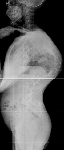 흉요추부 후만증은 가장 먼저 부모의 눈에 띄는 변형으로 방사선 소견상 흉추와 요추의 척추체가 납작해지고 연골성 척추체의 불완전 골화에 의해 특정적인 새부리 모양의 변형이 관찰됩니다. 또한 상하부의 발육부전에 의해 척추체의 전방 중간부위가 마치 혀를 앞으로 내민 것 같은 양상을 보이며 이러한 변화는 흉추 하부나 요추 상부에서 흔히 관찰됩니다. 흉요추부의 후만 변형은 방사선 상 관찰되는 이러한 변화에 기인하며 후만증의 정도는 심하지 않고 왜소증으로 인해 척추 성장이 비정상이므로 후만증의 진행도 심하지 않습니다. 체간이 짧은 불균형 왜소증을 보이며 성인기까지 정상적인 수명을 가집니다. 치상돌기의 저형성과 인대 이환으로 환축추 불안정성이 동반되는 경우가 흔하며 척수병증이 동반될 수 있습니다. 척추체의 설상 변형과 후방 전위 등으로 인해 척추관이 좁아지고 이로 인한 신경증상이 유발되기도 합니다. 치돌기의 발육부전 또는 선천성 결손이 흔히 관찰되며 환축추간 불안정성도 흔히 동반됩니다.